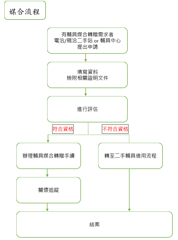媒合受理單位:需求民眾可攜應備文件逕向本站或本市輔具資源中心申請。